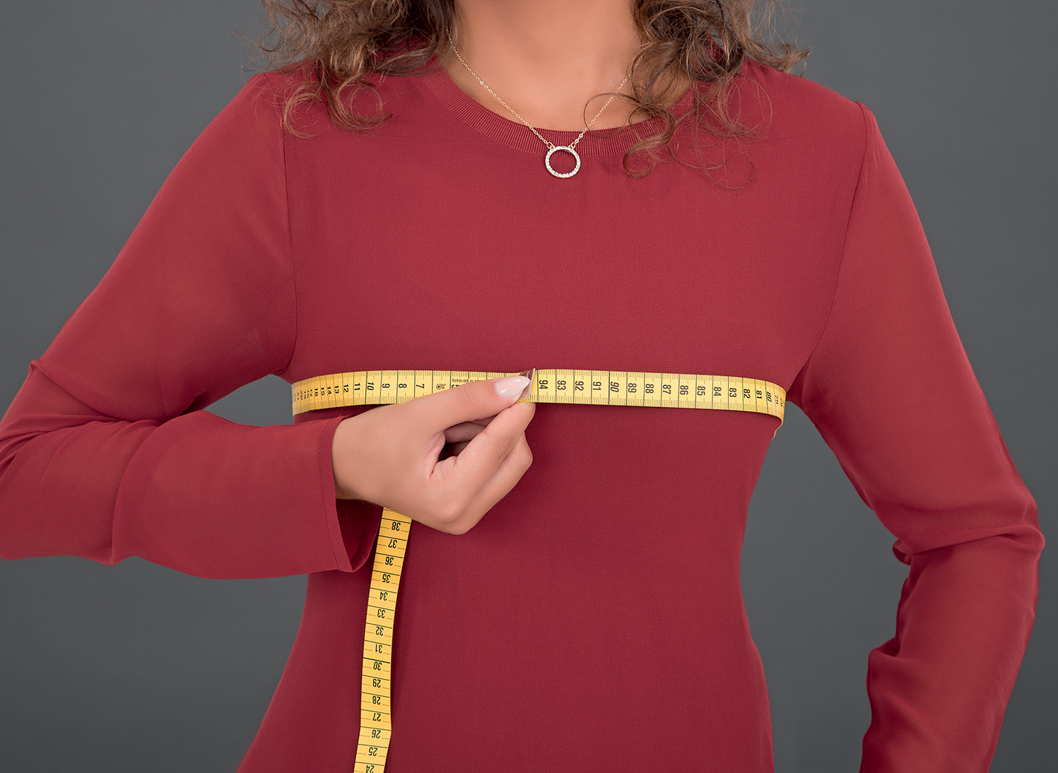 Use the tip of a measuring tape. Place the tape over the shoulder blades, under the arms, and over the fullest part of the bust.